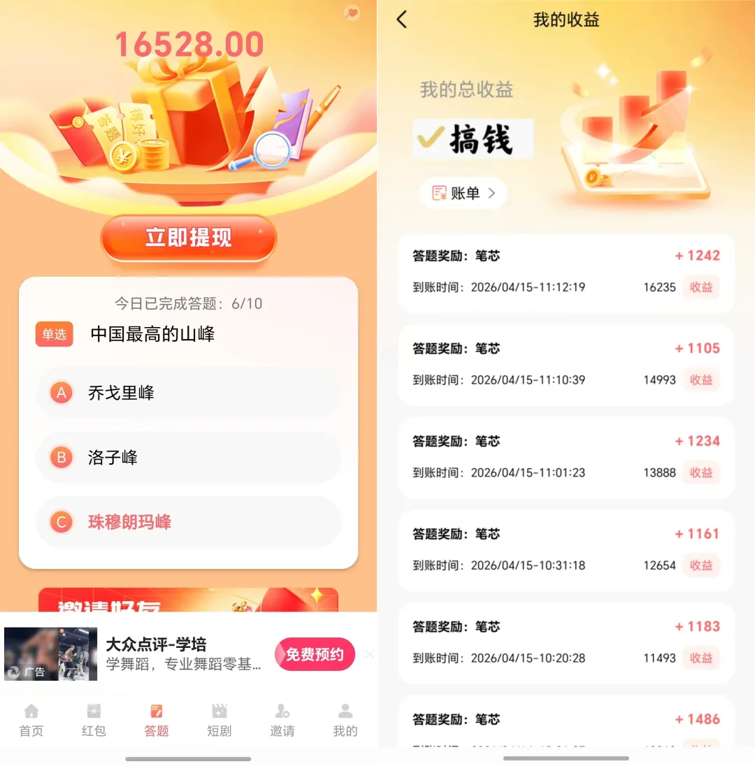 看广平台千千万万,笔芯这个时候上线也是非常有勇气的,玩了的朋友都说很不错,简单方便还不会乱跳广,还有答题这样的趣味小知识