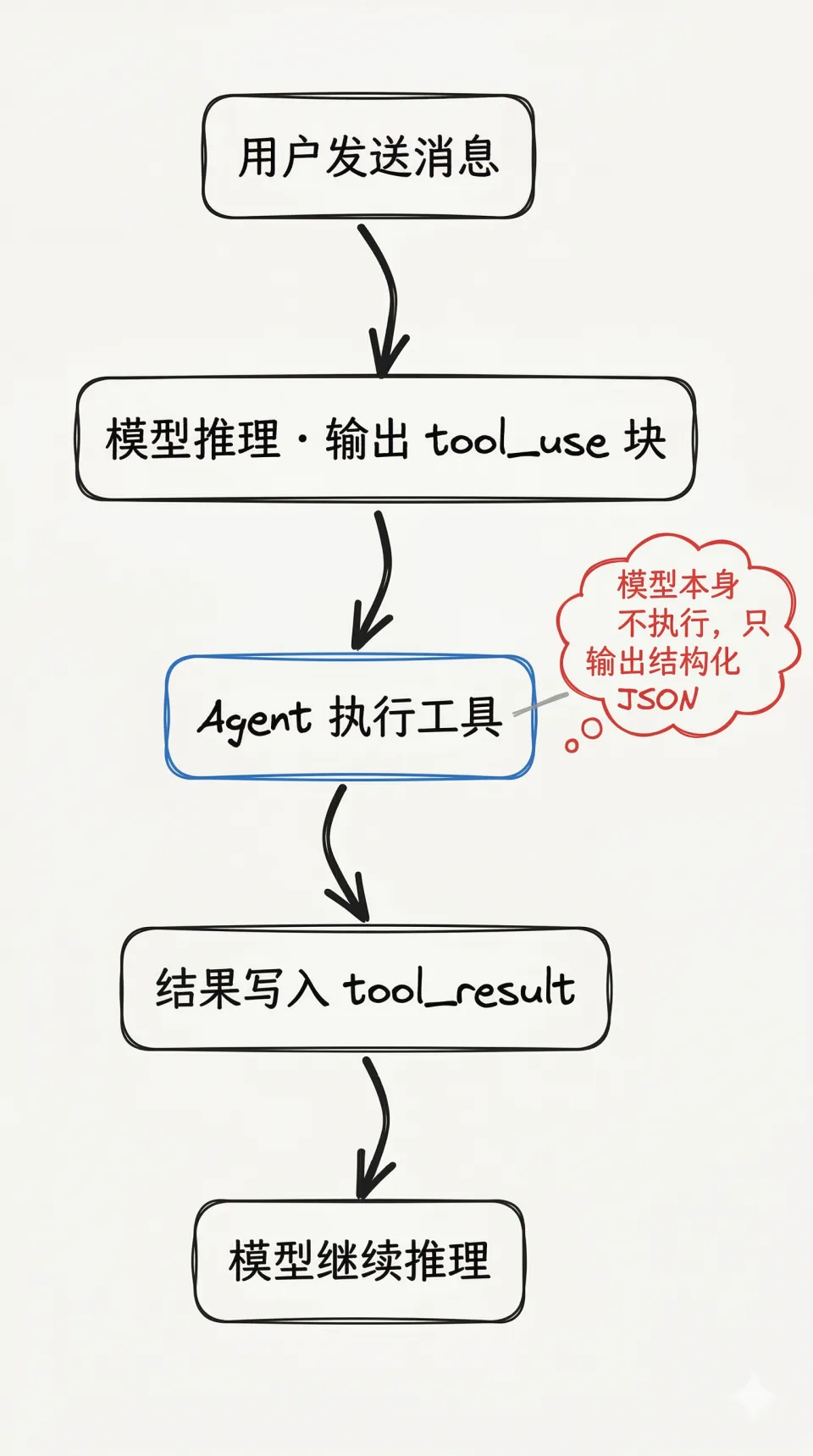 用户消息↓模型推理 → 输出 tool_use 块{ "type": "tool_use", "id": "toolu_xxx", "name": "工具名", "input": { ...参数... } }↓调用方(Agent)执行工具↓将结果作为 tool_result 追加到对话{ "type": "tool_result", "tool_use_id": "toolu_xxx", "content": "执行结果" }↓继续下一轮模型推理