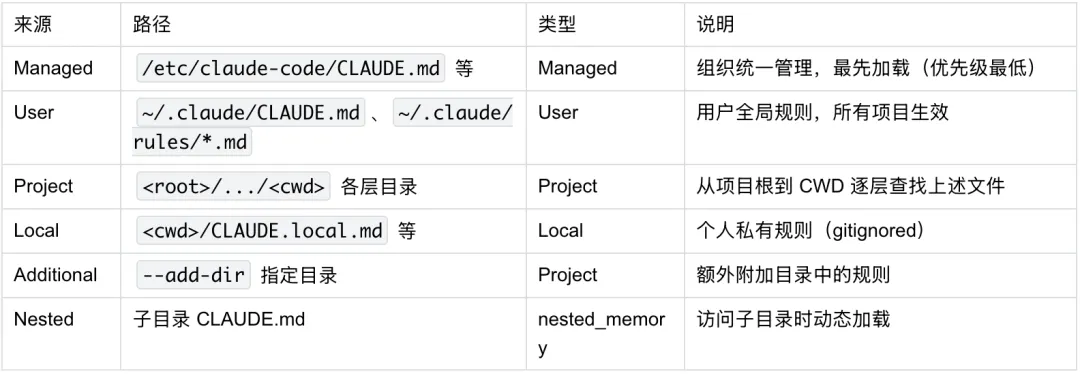 Claude Code 从多个位置按优先级加载 Rules(源码中对应 getMemoryFiles 函数)。实际加载逻辑是从项目根到 CWD 逐层处理,每层内部按 CLAUDE.md → .claude/CLAUDE.md → .claude/rules/*.md → CLAUDE.local.md 的顺序收集,后加载的覆盖先加载的。主要来源包括: