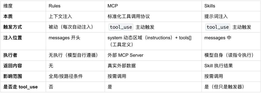 触发方式:Rules 每次 API 调用自动注入,Skills 需要模型判断后主动调用