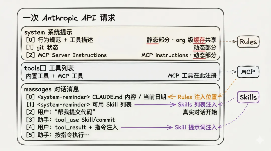 恰好 Claude Code 的源码在 GitHub 上泄漏,本文基于 v2.1.88 泄漏源码,从 LLM API 调用层面,拆解 Rules、MCP、Skills 的底层实现。看完源码你会发现,这三个概念远没有网上说的那么玄乎,它们的区别,本质上就是信息在 API 请求中被塞到了不同的位置。