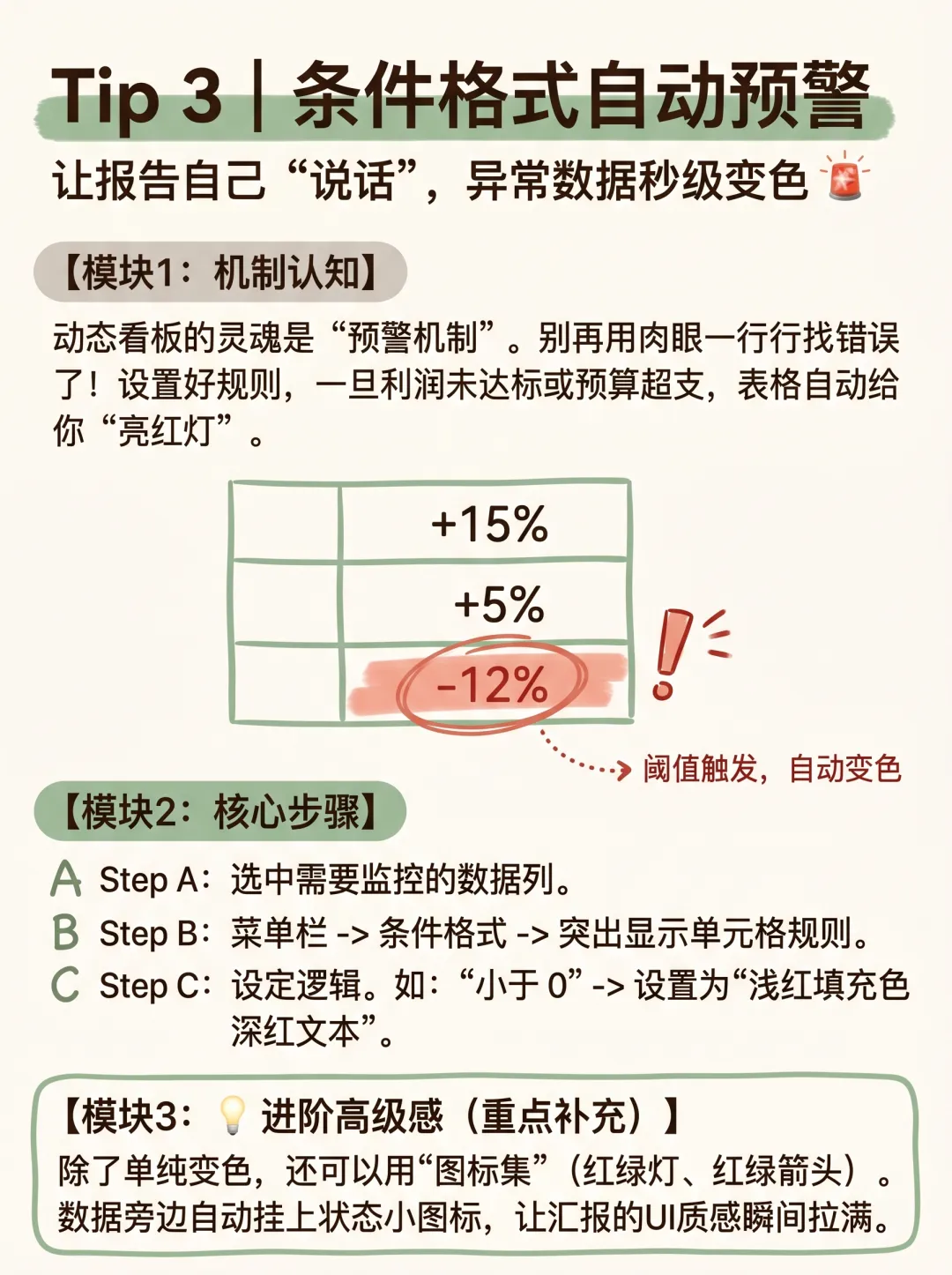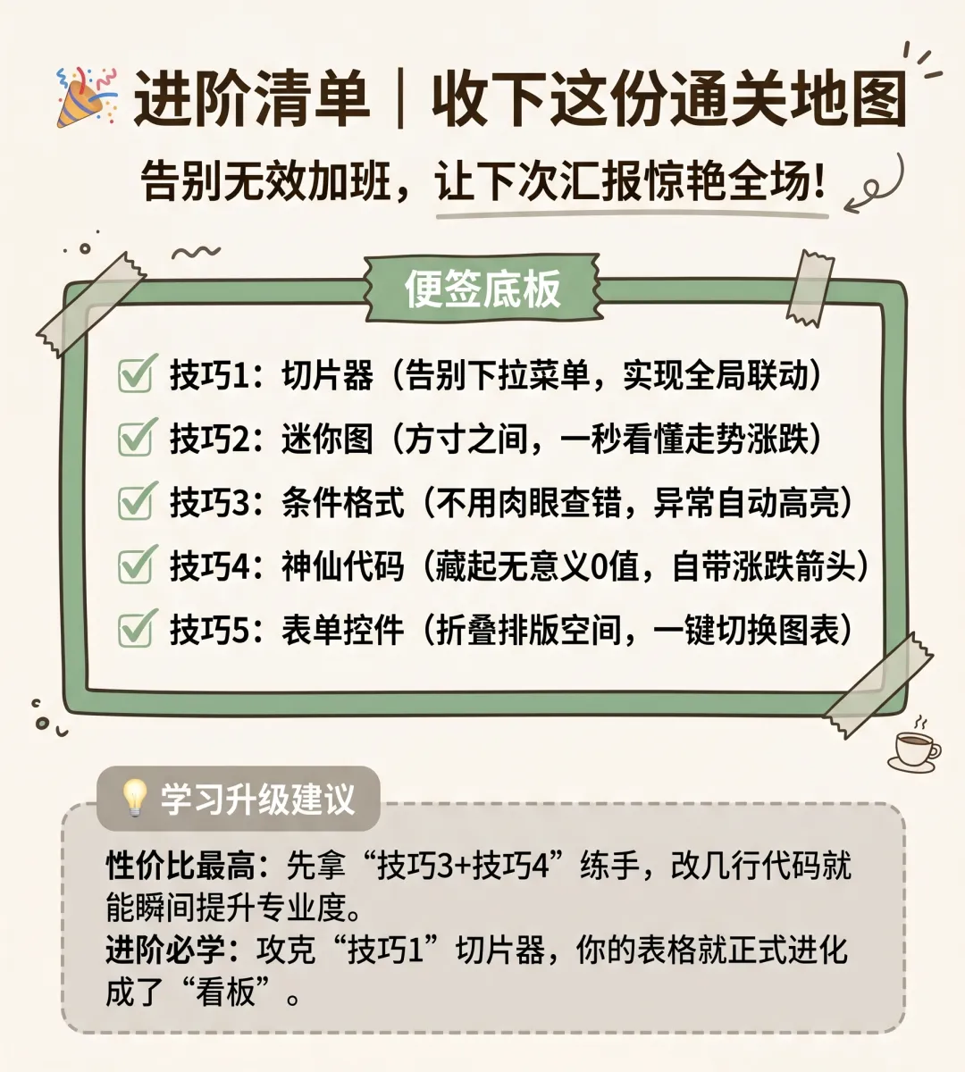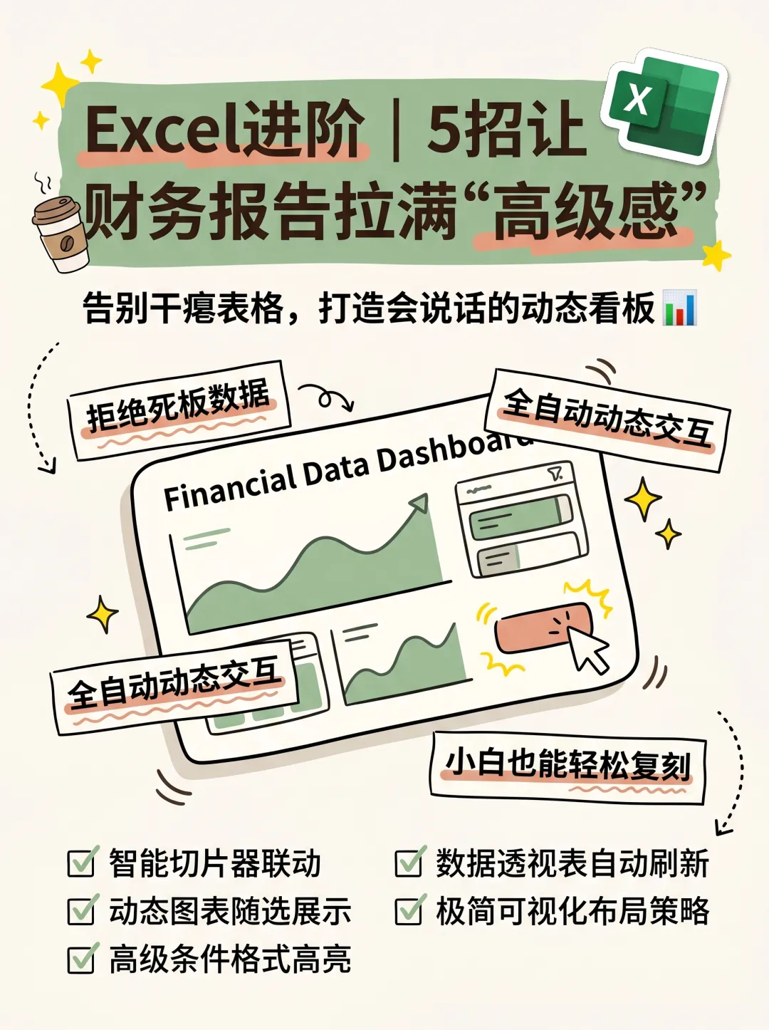 Excel进阶:5个让财务报告瞬间“高级感”小技巧 今天给大家带来一篇5个让财务报告瞬间“高级感”的小技巧,财务报表不仅要做得对,做的美观更能让枯燥的数据会说话,只要 10 分钟,就能让你的财务报告从“路人甲”瞬间变身“职场天花板”。 这下你学会了吗?建议你现在就打开手头的报表,挑一两个技巧试一下。相信我,那种“变美”后的成就感,真的会让人上瘾! 祝大家能在各自的领域里面闪闪发光✨。