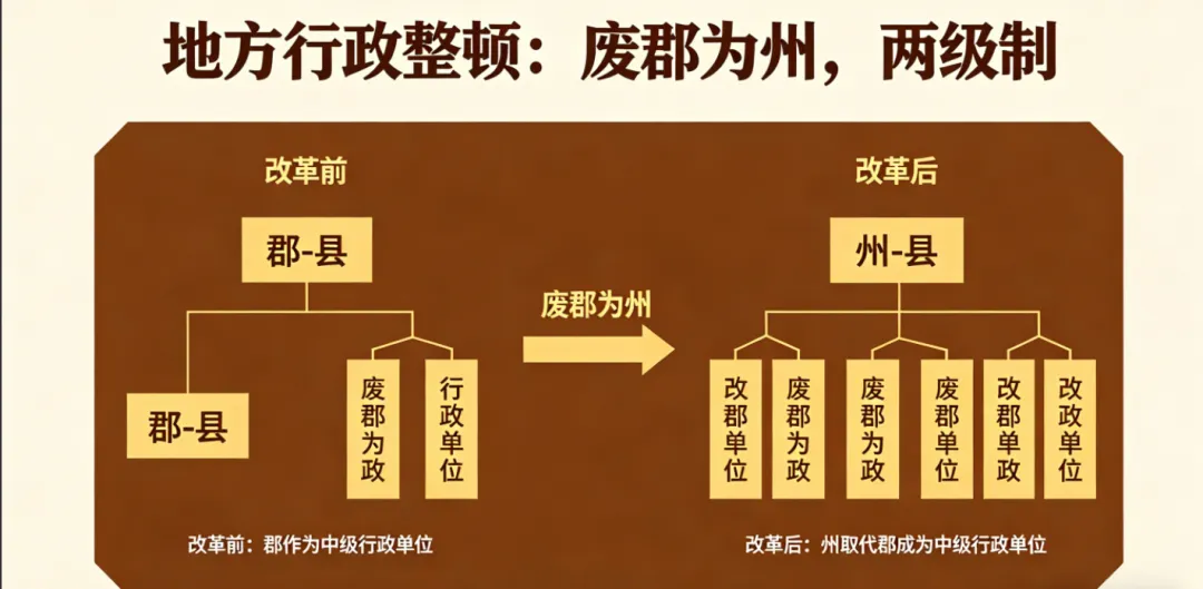 推行州县两级制,裁撤冗官,收回地方人事权,削弱豪强与门阀割据基础。