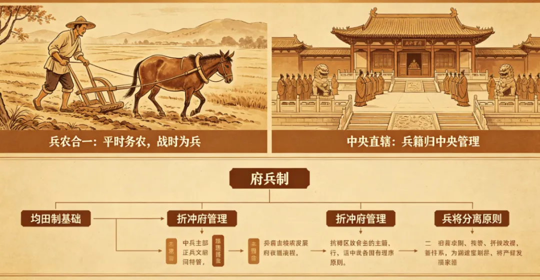 举措:开皇十年(590),令军人悉属州县,垦田籍帐一与民同,兵农合一;军府统领依旧,军队直属中央,削弱地方兵权。