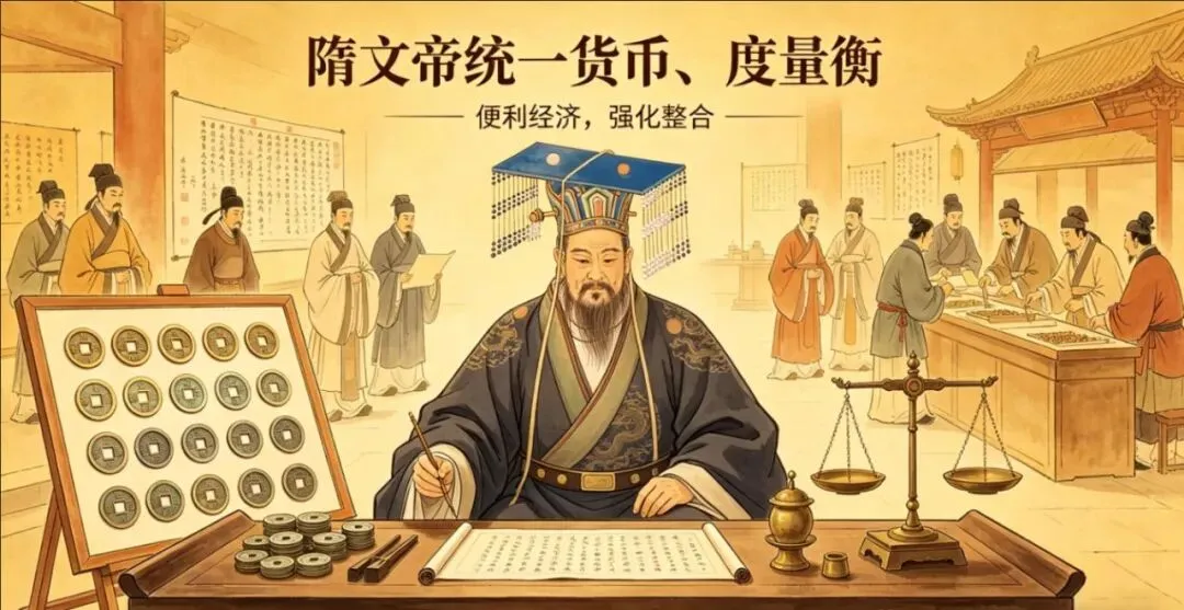 举措:废前朝杂币,铸五铢钱;统一斗、秤、尺,全国标准一致。