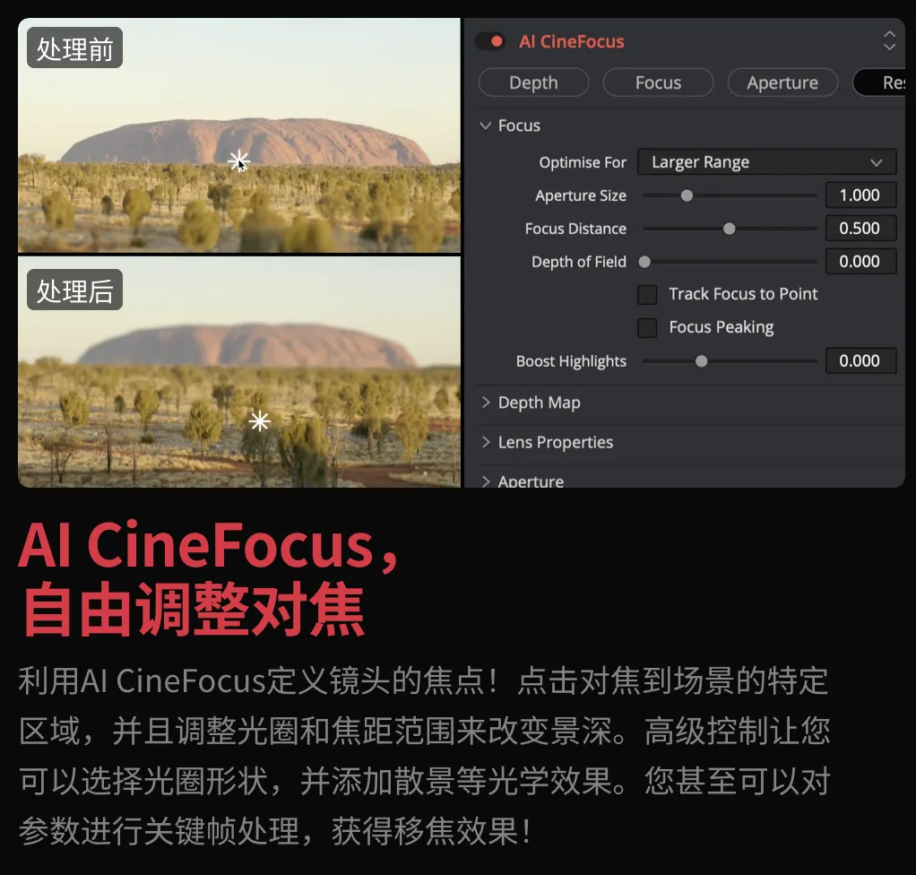 这个功能有点惊艳,很像iPhone的玩法,用户前期简单拍,后期再调整焦点和虚化,大大降低难度和复杂过程,可能这个会改变普通用户的拍摄习惯,但是达芬奇在普通用户群体还是不够普及.