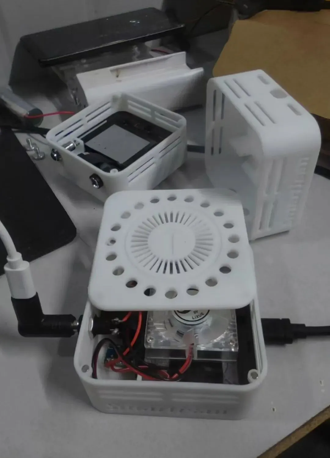 直接上成品,这是用锤子的坚果Pro3手机改造的小主机,处理器是骁龙855 Plus,可以搭配锤子TNT系统实现扩展输出,不输三星DeX一线传模式。这个外壳是用3D打印的,加了磁吸盖板,材料是9600光敏树脂。此外还改了通电自启动和5V/2.5A直供电模块,嵌入了40x40mm的散热片,还安装了一个5V的散热风扇。