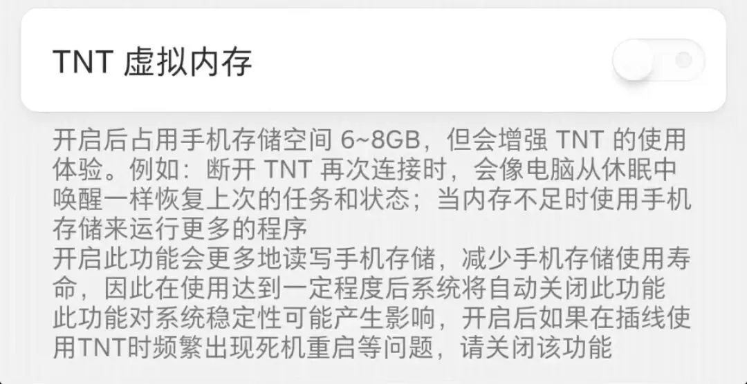 坚果Pro3的常见存储组合是8G+128G,虽然自带内存只有8GB,但开启TNT虚拟内存可以扩展到16G。当然,这个虚拟内存确实比较“虚”,我反正不用,开启后是从存储拨出一部分空间,还可能导致微卡。
