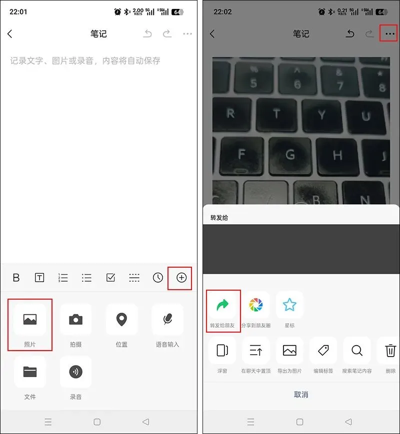操作:进笔记→+号→【照片】选视频/图片→完成→右上角【…】→转发给朋友,搞定!