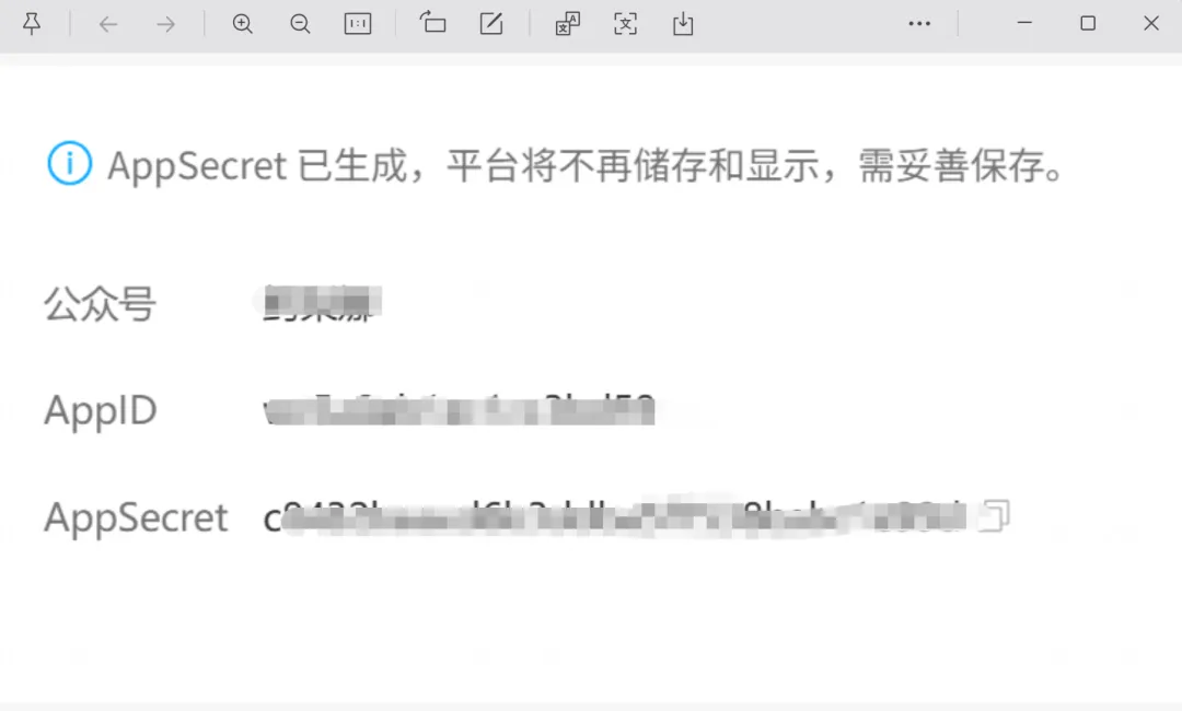 你得先去公众号后台找 AppID 和 AppSecret。找到 AppID 的时候我还挺平静,哦,在这儿。结果往下一看,AppSecret 那一栏写着一行特别冷静的话,大意就是,这个值只会给你看这一次,请妥善保存。