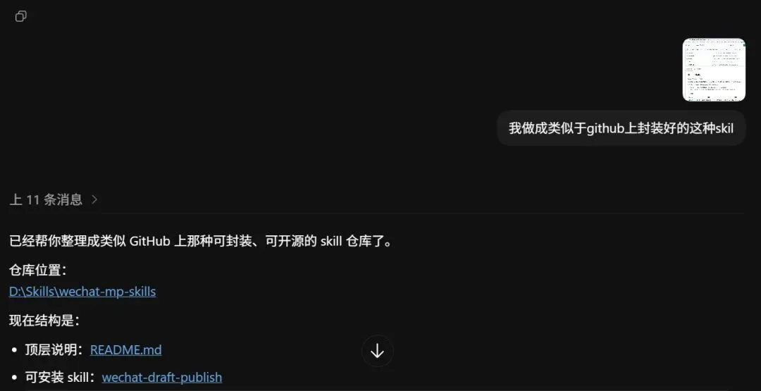 我直接把别人 GitHub 上一个封装好的 skill 仓库截图发给了 Codex。就那张图。然后说了一句,请参考这个形式。