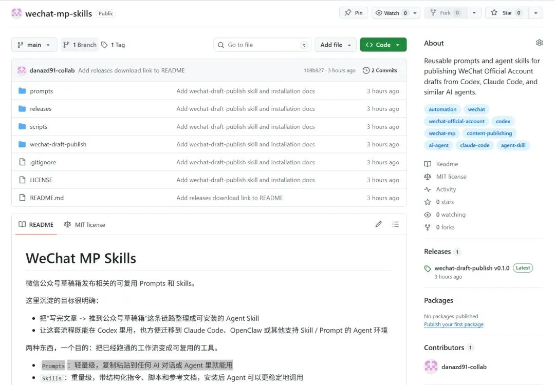 它能干的事很具体,就是把我写好的文章直接推到微信公众号草稿箱里,我知道这种东西应该有人已经做过了,但我还是想分享这次和Codex一起跑通的经历。后面我把它整理成了 GitHub 仓库,补了 README、安装方式、release,别人也能直接拿去装。