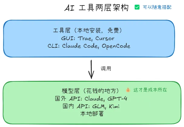 - 模型层才是关键:你可以用 Trae 调国内的 GLM,也可以用 Claude Code 调国内的 API——这两层是可以随意搭配的