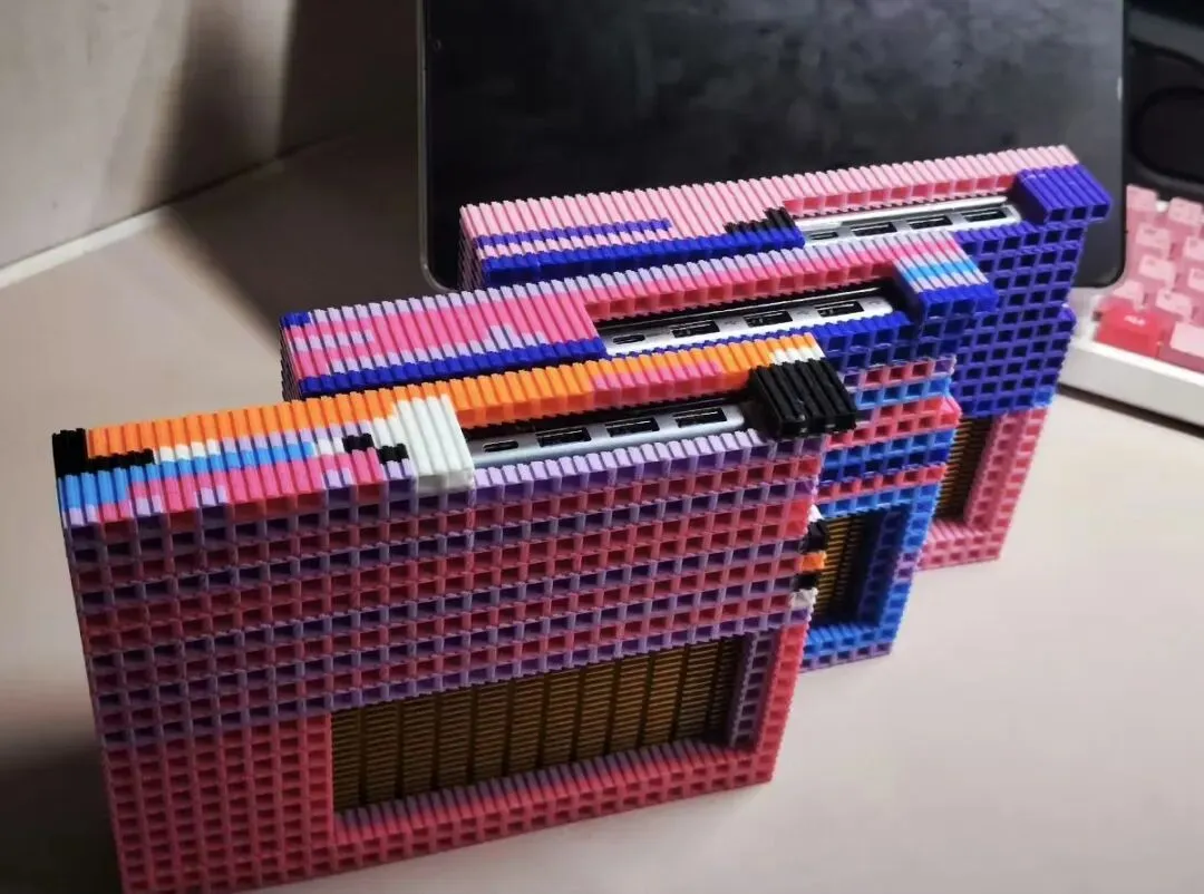 这是一款用三星Fold3主板改造的小主机,配置对应骁龙888+12GB+256GB。它的外观很有辨识度,看上去跟乐高积木拼接似的,实际上是3D打印的一体化多彩外壳,底部预留了大面积的散热孔,背面是一个Type-C口和三个USB口。