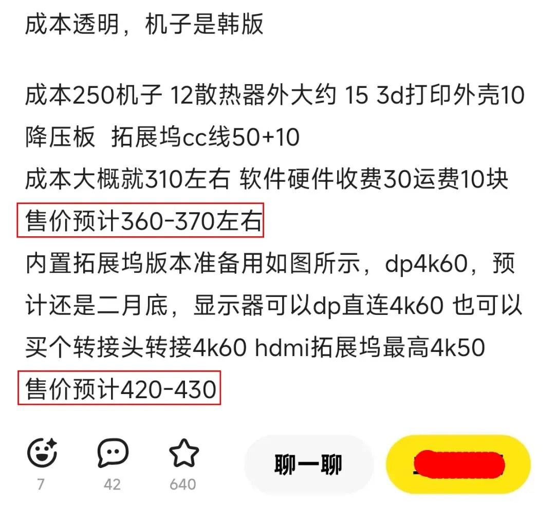 不过改造者还没大批量贩卖,只是开了个众筹贴,还把成本公开了。预计带扩展坞价格420-430,不带扩展坞价格360-370,共有640人收藏。此外,批量化改造都用买韩版/美版废屏机,如果你自己有手艺,成本还可以更低。