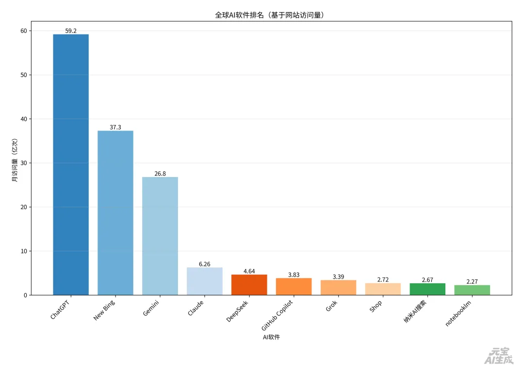 ChatGPT保持领先:月访问量59.2亿,仍是全球最受欢迎的AI应用。