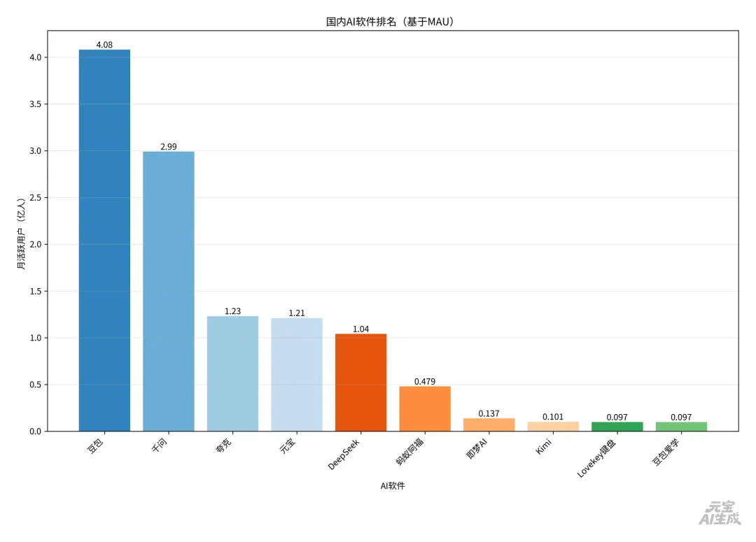 腾讯元宝增长强劲:MAU达1.21亿,环比增长103.73%,显示微信生态整合优势。