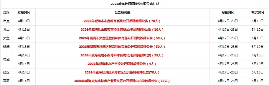 2026威海教师招聘314人公告职位表汇总(市直及各县区)