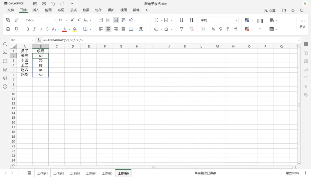 在 B2 单元格中,生成介于 50 到 100 之间的随机分数: