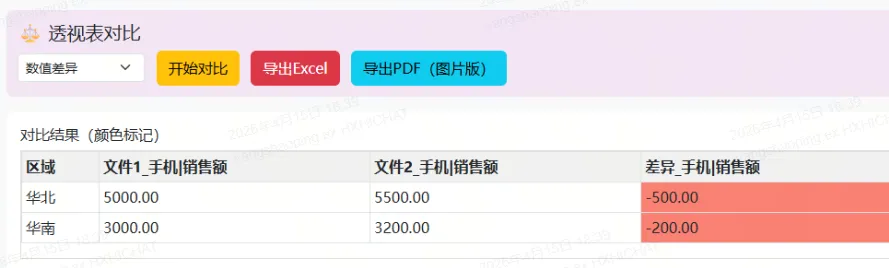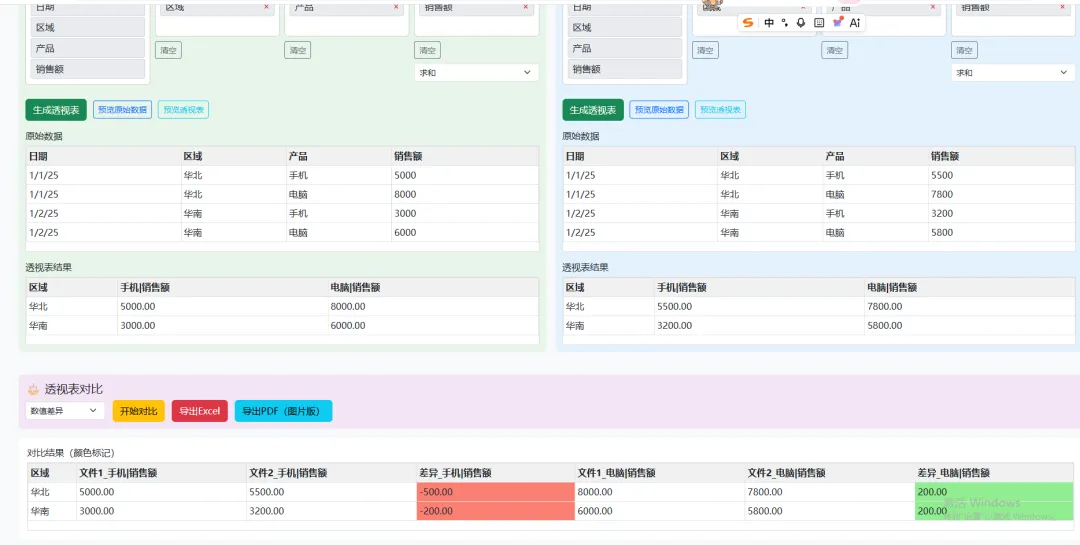本项目是一款纯前端实现的 Excel 双文件透视对比工具,用户可以在浏览器中加载两个 Excel 文件,分别配置透视表的行、列、值字段和聚合方式,生成透视表后进行数据对比,并将对比结果以颜色标记的方式可视化呈现。工具支持导出对比结果为 Excel 和 PDF 格式,同时内置测试数据生成功能,方便快速验证。