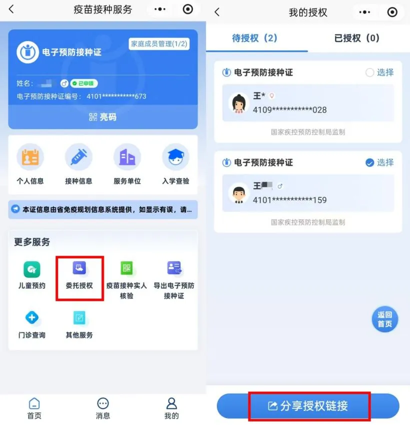 小贴士:自己不在身边,其他家人朋友带孩子接种疫苗时,可以点击“委托授权”,分享授权链接,让家人朋友在浏览器中打开,输入完整手机号保证安全,生成二维码,接种单位扫码就可以接种疫苗啦!