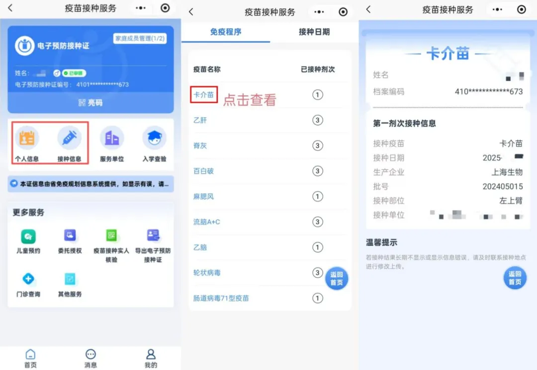 疫苗种类、接种剂次、接种时间、生产企业、生产批号、接种部位、接种单位等,随时查看,一目了然!