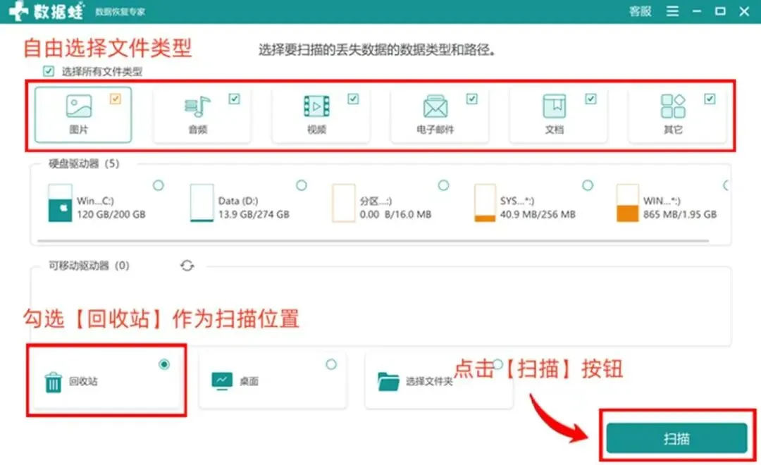 第二步:打开软件后,它会自动识别电脑中的存储设备和分区。若你是从回收站误删文件,直接选择系统盘(C盘),然后勾选文档类型(或全选,确保不遗漏),点击开始扫描按钮,软件将进行快速扫描。