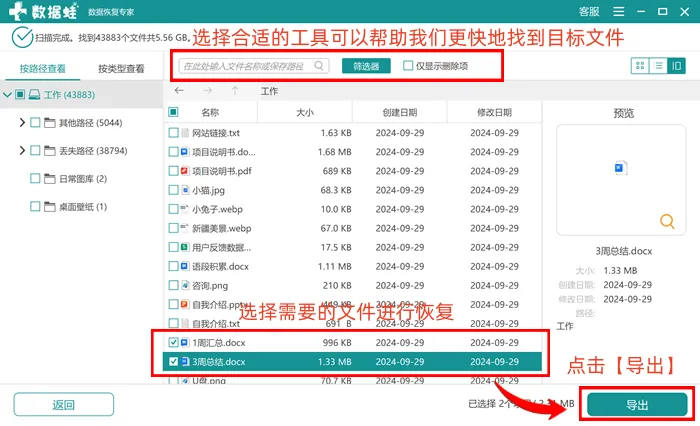 第四步:导出恢复的文件。勾选目标Word文档后,点击右下角的导出按钮,选择一个非C盘的保存路径,点击确定等待导出完成。打开保存路径,即可查看完整的文档。