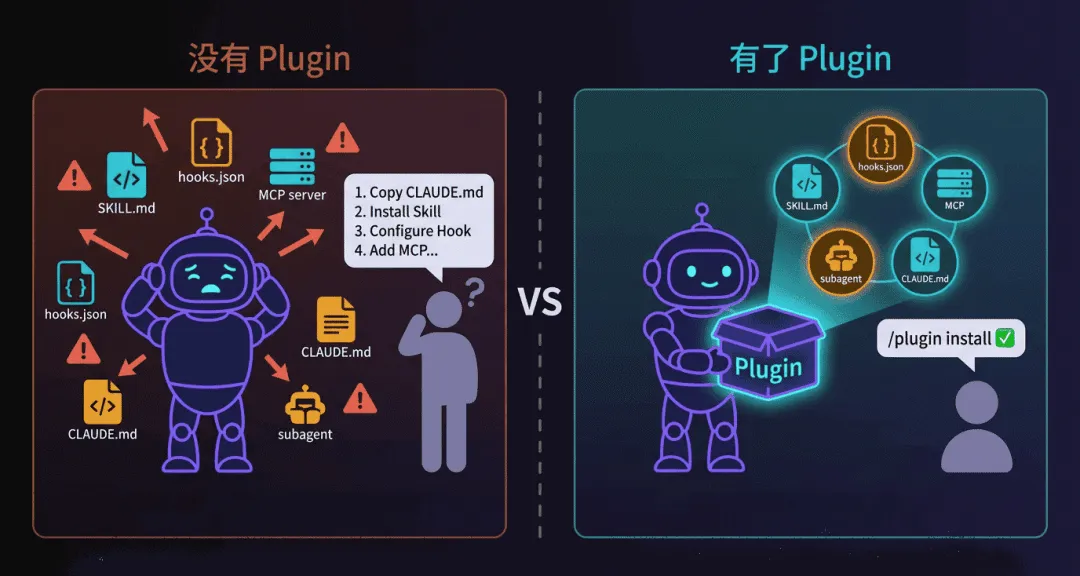 它把 Rule、Skill、Subagent、MCP Server、Hook 这些东西,打包到一个目录里。你装一个 Plugin,里面所有功能一次到位。