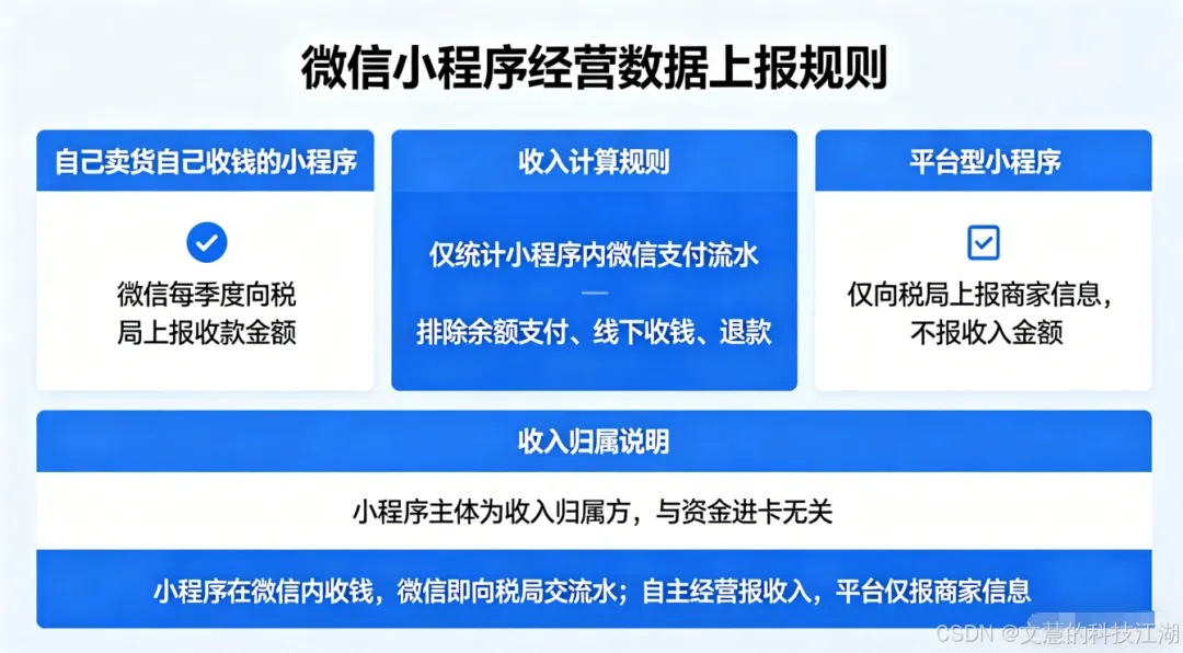 自营型小程序:平台报送税务部门你的小程序的经营者身份信息及季度的收入统计数据。