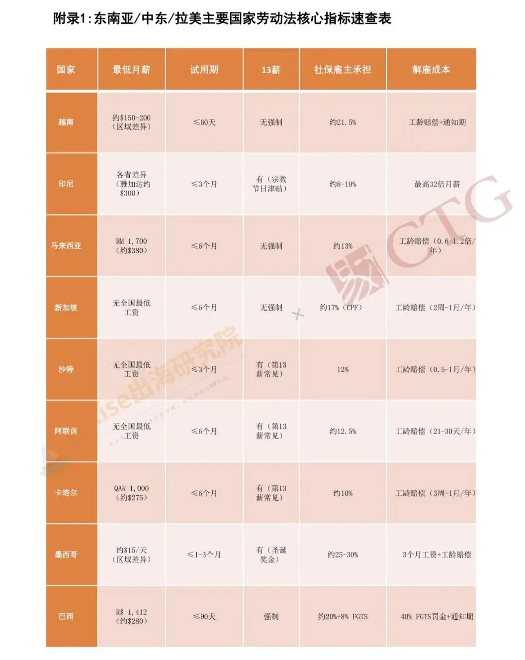 报告附录包含东南亚/中东/拉美主要国家劳动法核心指标速查表(2026年3月更新) 及用工合规尽职调查清单覆盖最低月薪、试用期、13薪、社保雇主比例、解雇成本等关键数据,便于企业快速对标。