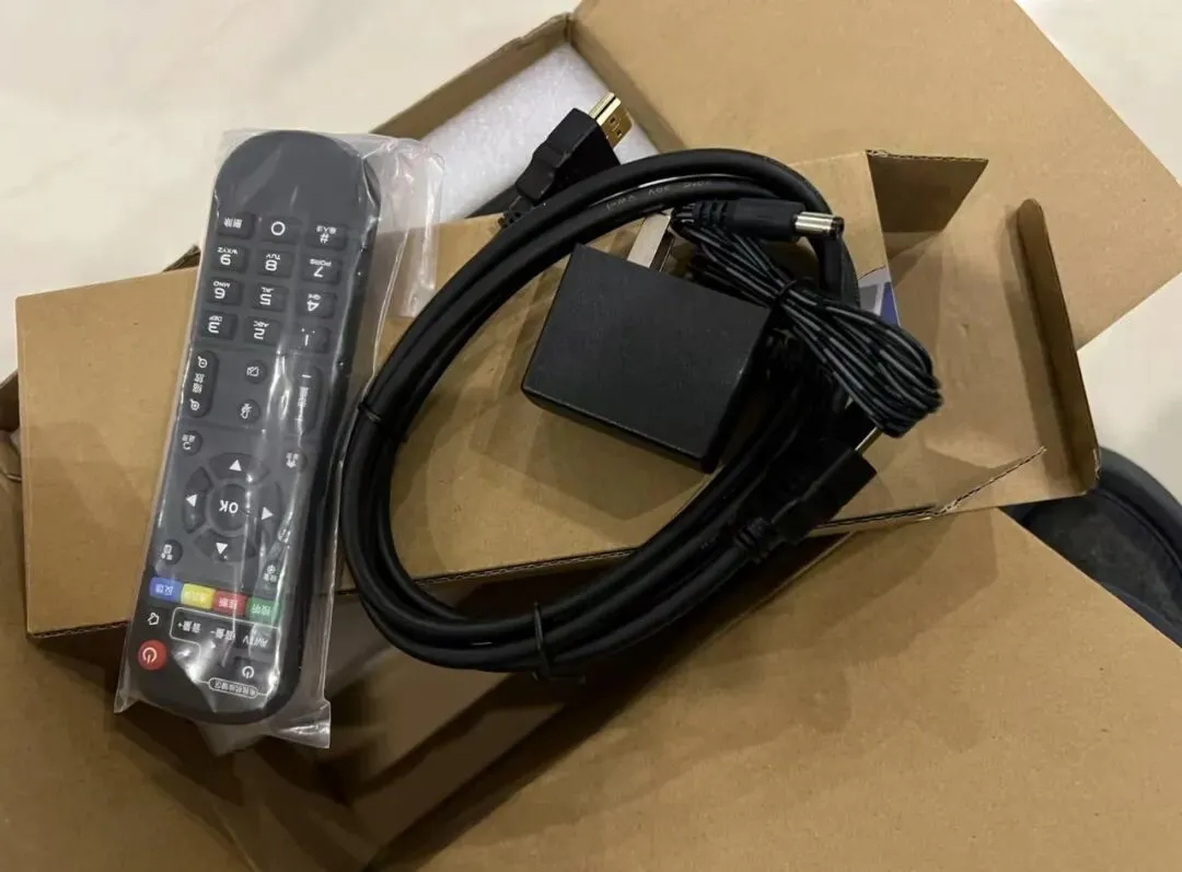 还好它接口丰富,可以插U盘来扩展容量。除了2个USB 2.0接口外,还有3.5mm音频口、1个百兆网线口和1个HDMI口,支持蓝牙5.0和WiFi 2.4G,配件就充电器、HDMI线和遥控器这三样。