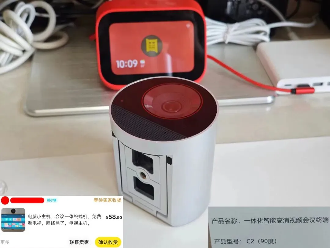 这个产品品牌未知,原先是口罩期间政府机关开会专用的,产品全名叫“一体化智能高清视频会议终端”,型号是C2。它采用了圆柱形设计,外观跟微软Surface HUB2网络摄像头很像,正面是一颗1080P高清摄像头,支持90度超广角。这玩意闲鱼均价75元左右,我是58.5元拍的裸机,无遥控无电源。