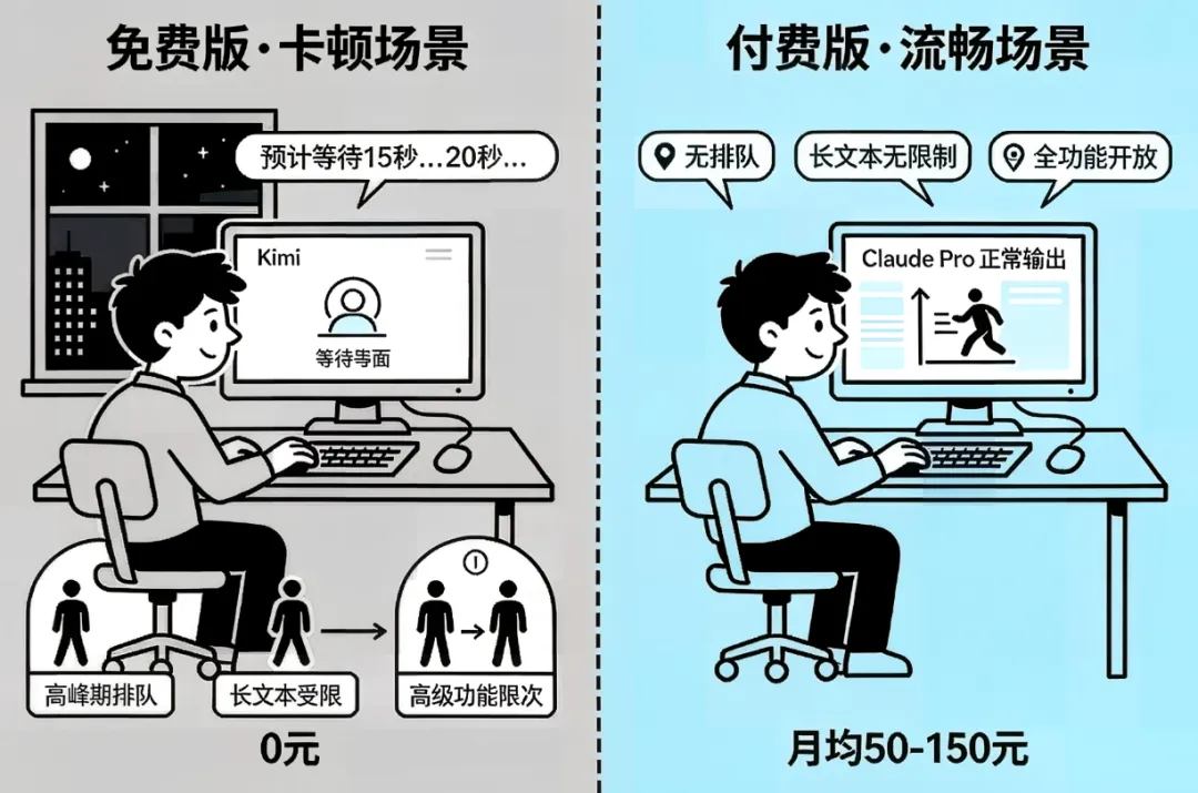 实测一个小场景:上周三晚9点打开Kimi,提示”预计等待15秒”,刷新后变成20秒。付费优先通道在这里体现价值——不是让AI变聪明,是让AI在你需要的时候一定在。朋友老周更有意思,他买了Kimi包年399元,折合每天1块钱,他说这钱买的是”不卡顿时的心安”。