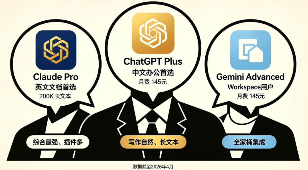 建议:中文办公选ChatGPT,英文文档选Claude,Workspace用户选Gemini。