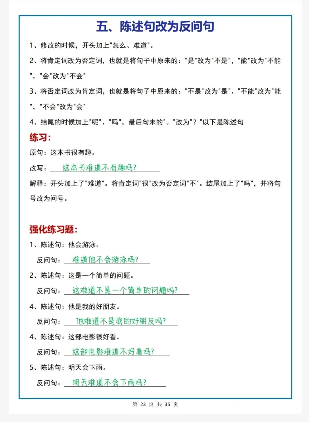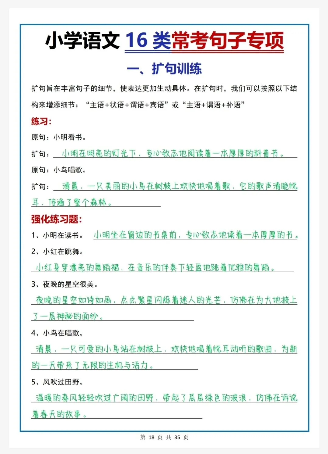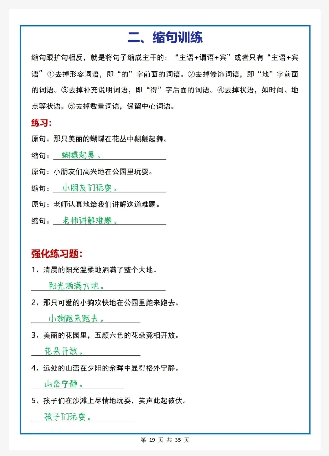 扩句、缩句、陈述句改反问句、把字句被字句、修改病句……