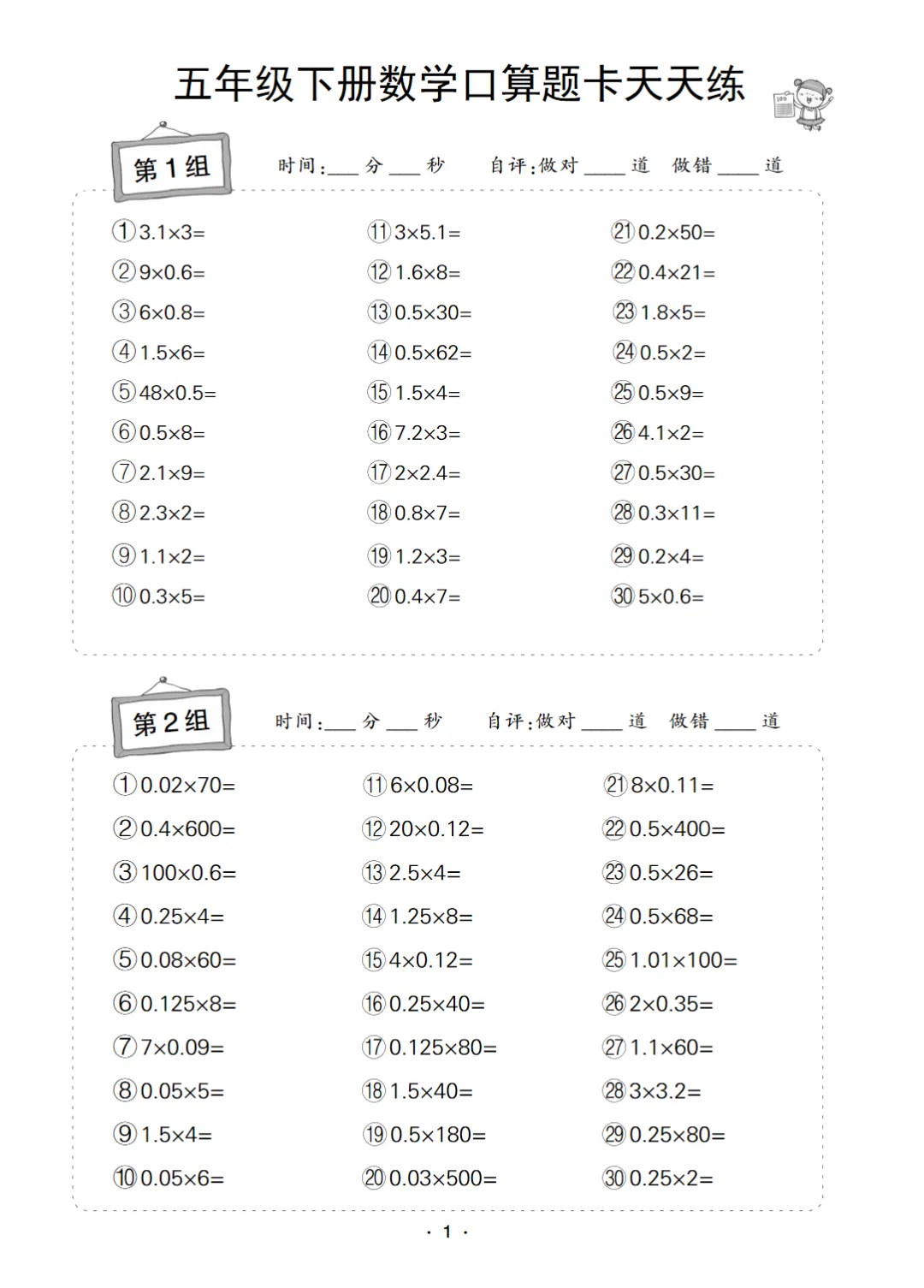 【免费下载】五年级(下)数学 口算题卡天天练,PDF电子版,可打印