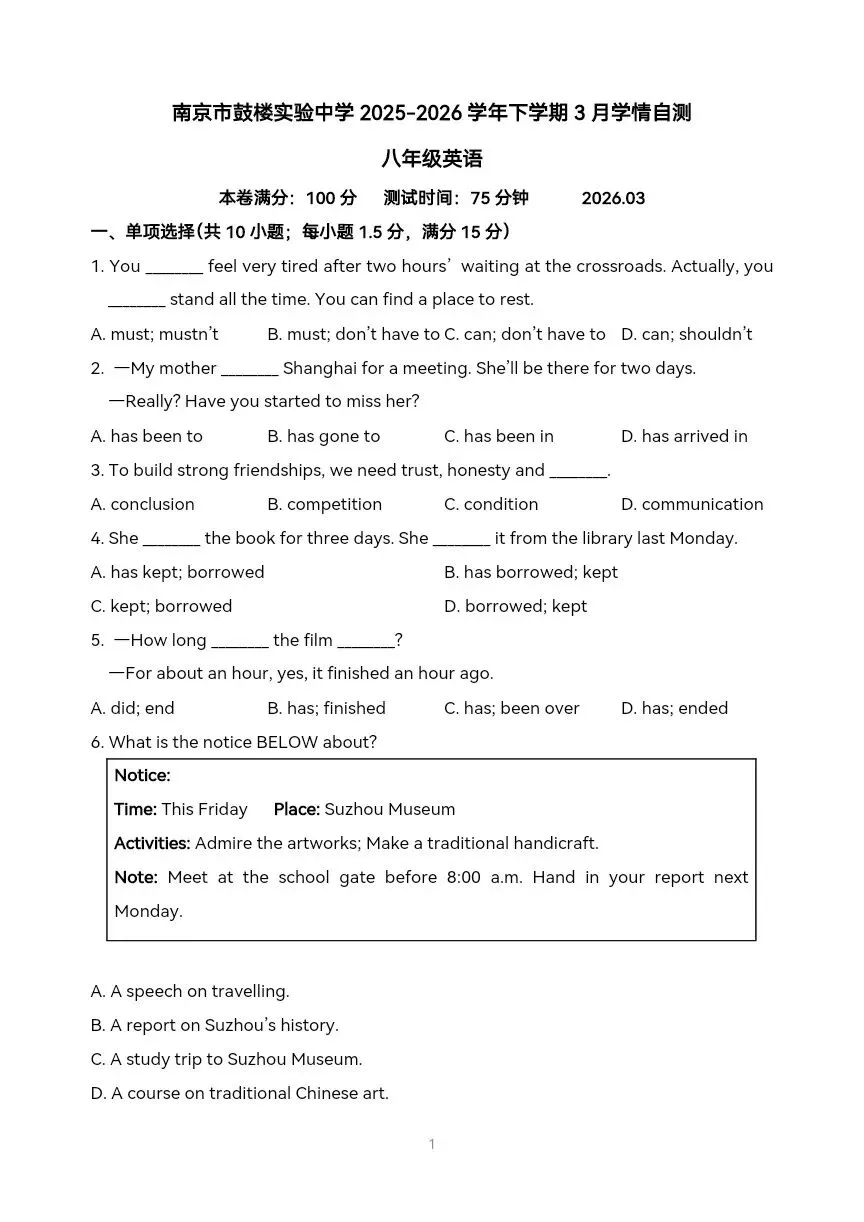 八年级英语名校月考系列,为您提供各地名校英语月考试题,有答案,手机端可直接打印。做名校英语月考试题,感受纯正地道的英语表达,扩大知识面,巩固重要语言点,让自己的英语水平踏上新台阶。