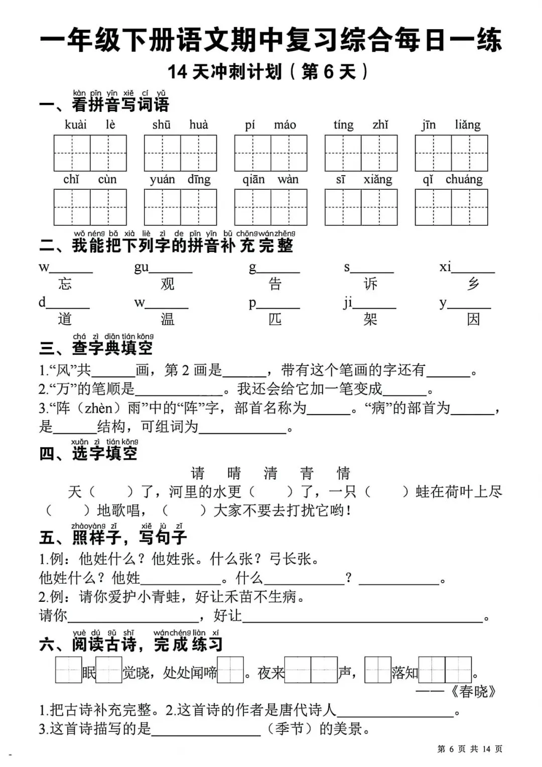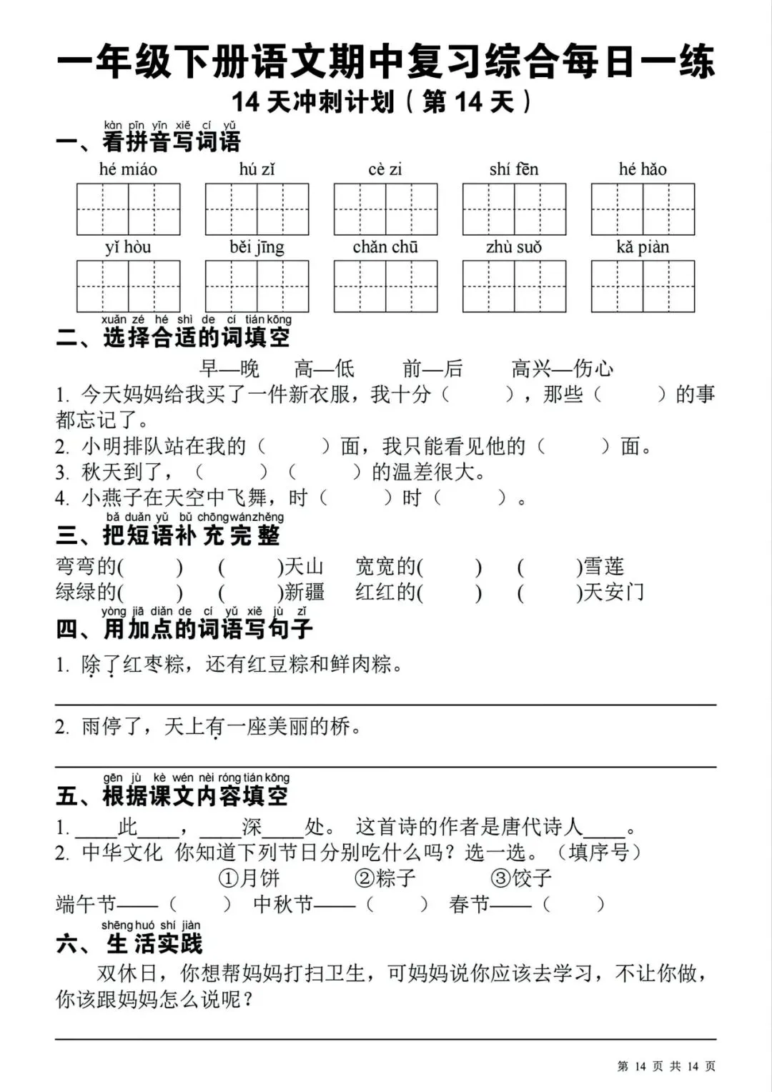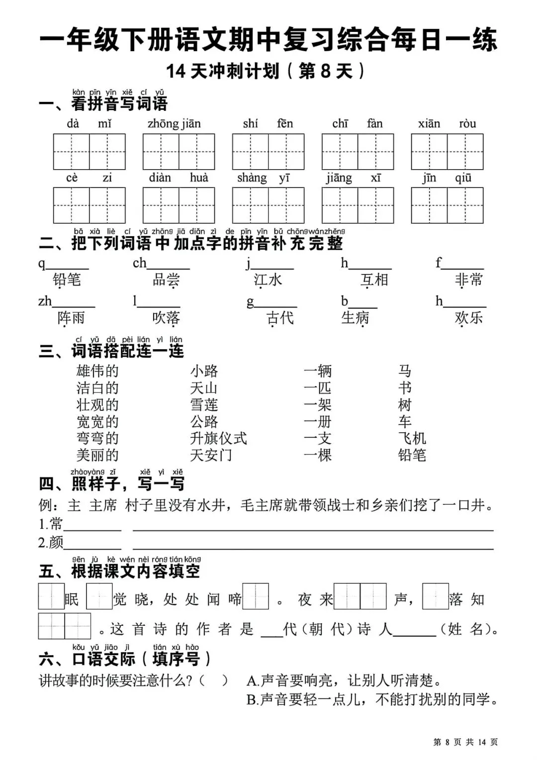 一年级下册语文期中复习每日一练丨可打印