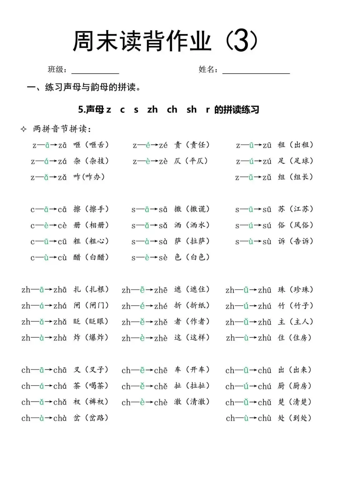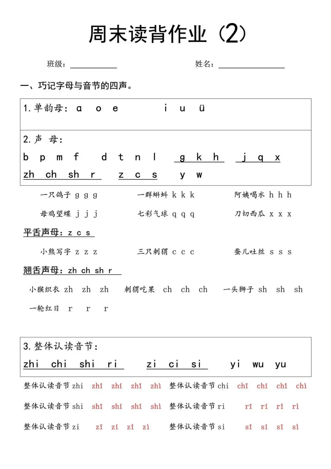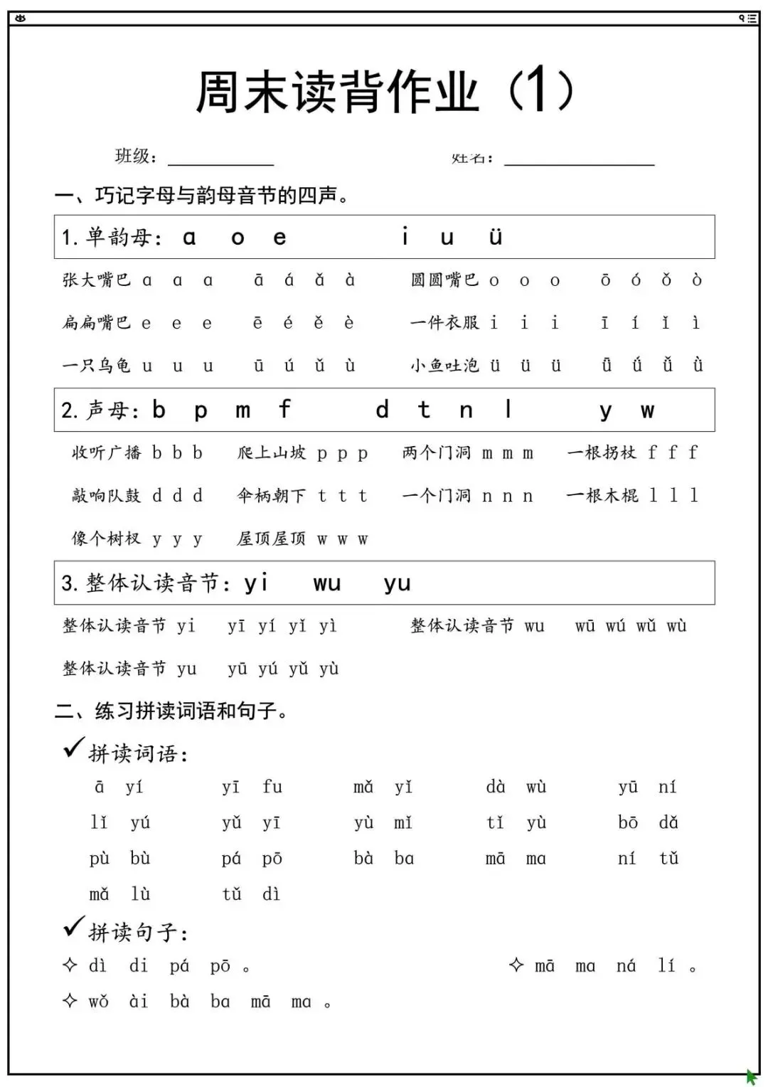 幼小衔接汉语拼音字母周末读背作业,电子版可下载可打印.