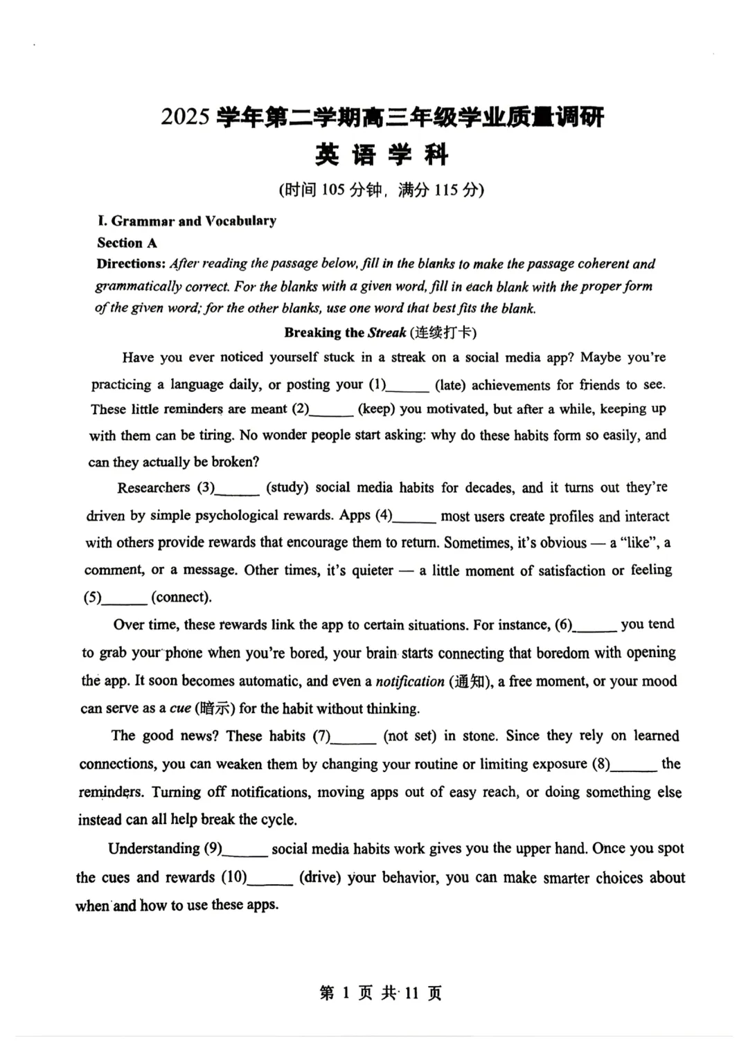 【高三二模】(可下载)上海市闵行区2025-2026学年第二学期高三年级学业质量调研英语学科试卷(点击“阅读原文”获取)
