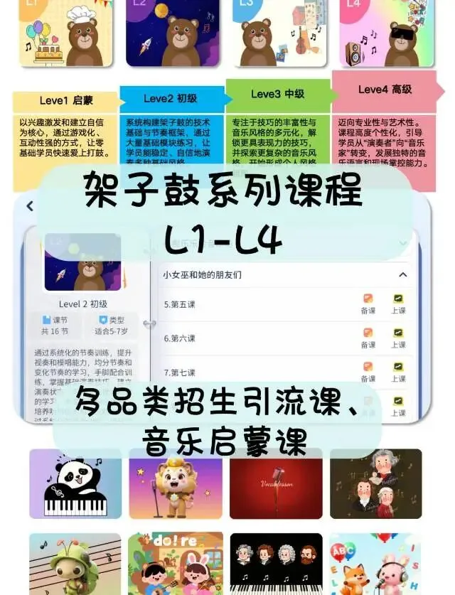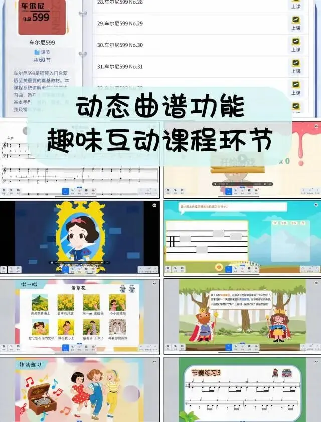 1.全品类课程覆盖:钢琴、架子鼓、声乐、音乐启蒙…分龄分级体系超完整,各种英皇、央音教材直接做成动态曲谱,孩子跟着练超省心。