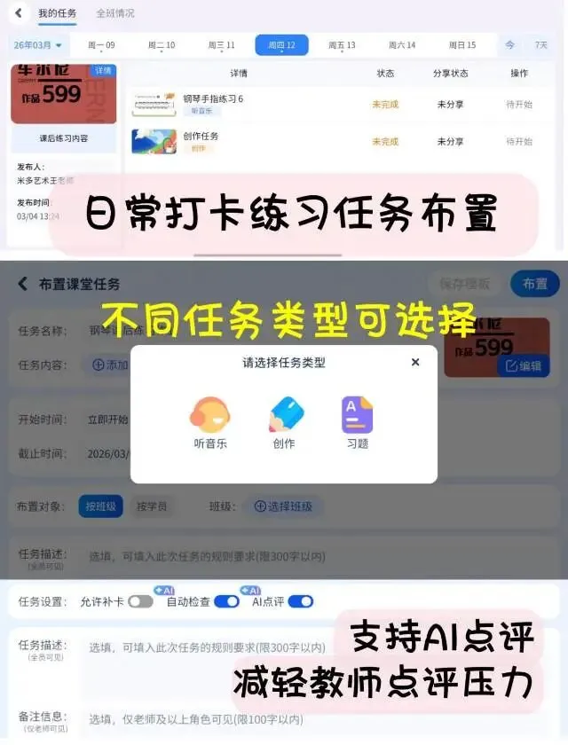 1.一键布置打卡任务:听音乐、创作、习题三种类型任选,按班级/按学员精准推送,AI自动检查+点评,减轻老师的压力。