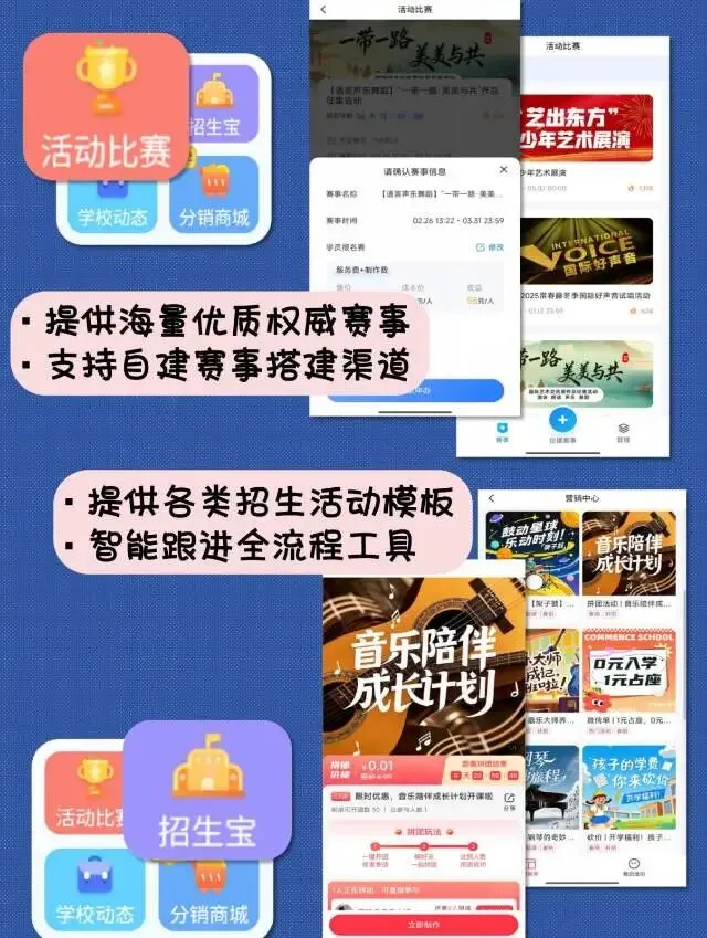 3.分销商城+招生宝:老带新裂变、分销返佣,帮机构低成本获客,生源源源不断。