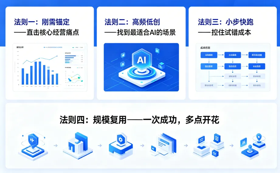 别一上来就搞要重构整个ERP系统、要打通全链路数据、周期超半年的大项目。优先选投入小、周期短、30天内能形成业务闭环的场景——单店智能排班、单品AI选品测试、单区域会员智能触达都是好选择。控住试错成本,在不断验证中积累组织的AI能力。