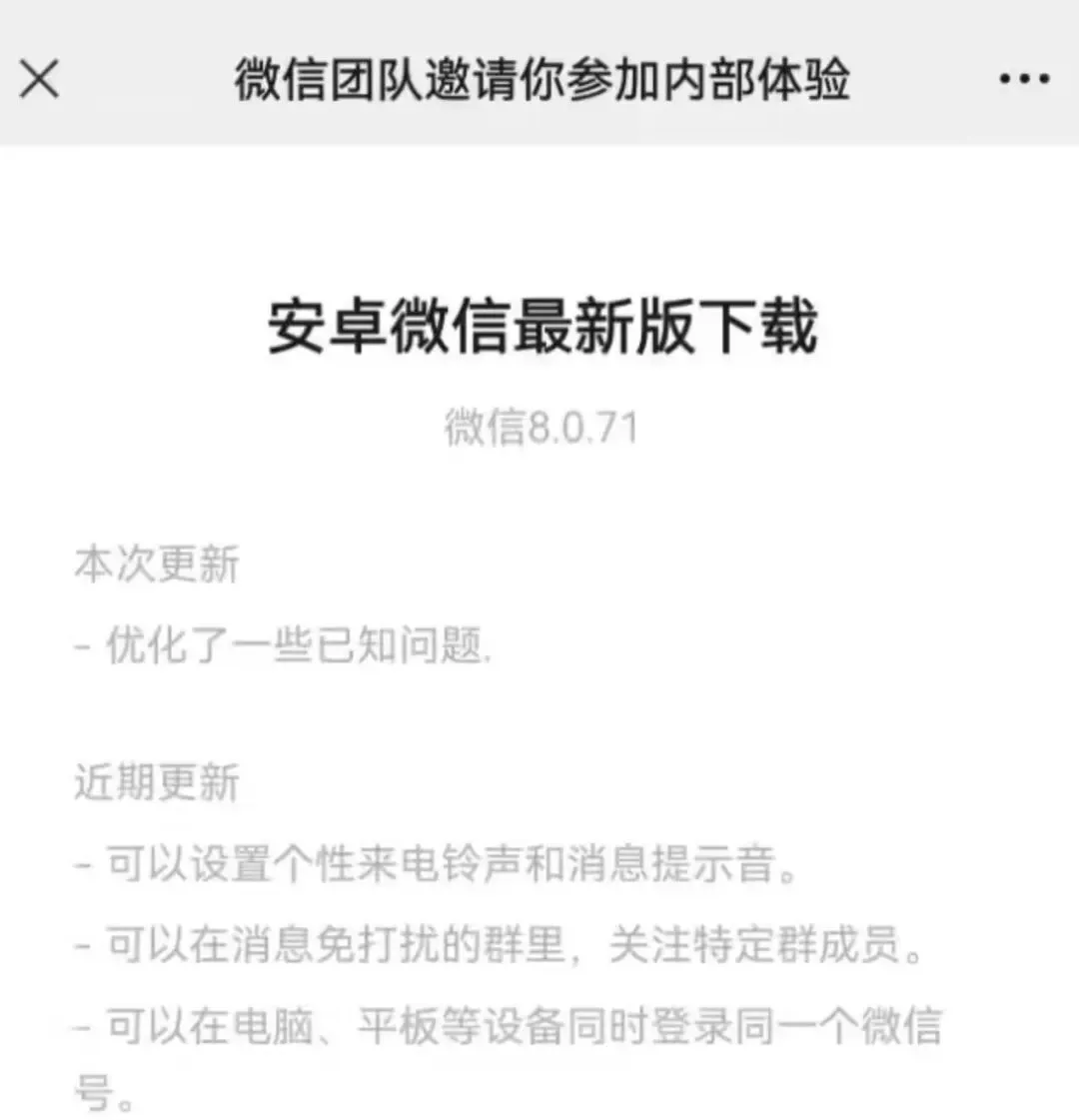 微信安卓8.0.71内测版终于在今日迎来正式推送,没有过多造势,官方直接放出了更新名单和功能点。