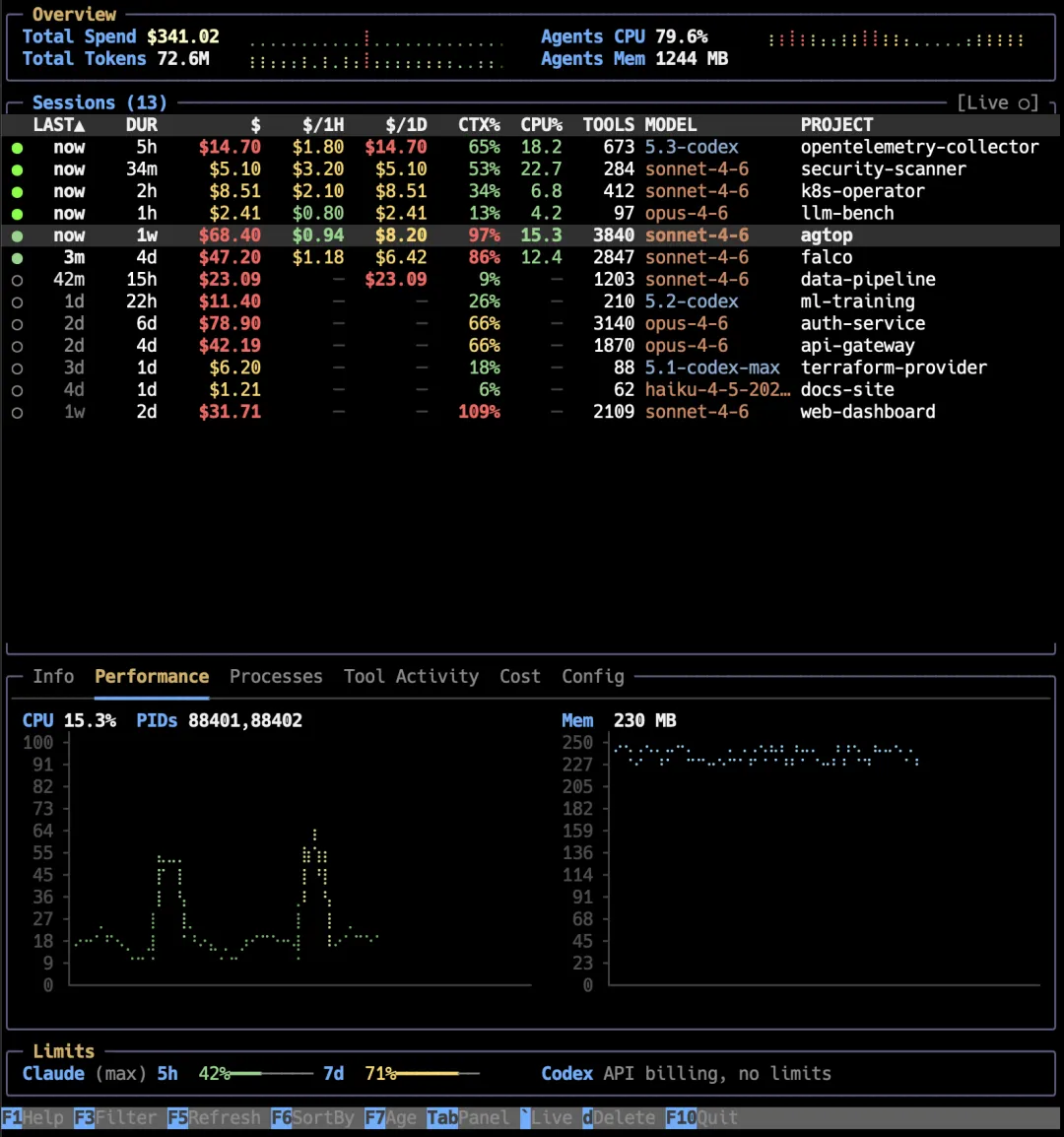 agtop:AI 编程助手监控神器!Claude Code / Codex 会话实时监控,花费、Token、CPU 占用全掌握!