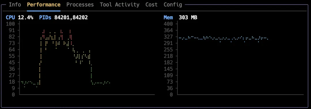 每个会话的 CPU 和内存使用火花线图,时间轴上的性能趋势一目了然。