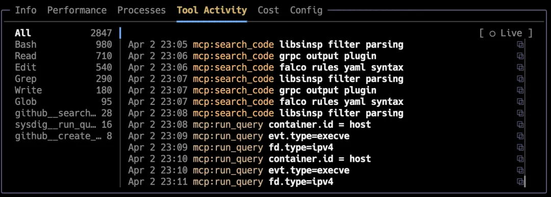 一键切换到”实时模式”,只显示正在运行的会话,查看实时 CPU%、花费速率和工具调用计数。