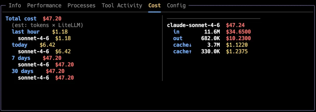 💰 花费追踪 – 每个会话花了多少钱,按小时/天统计 -